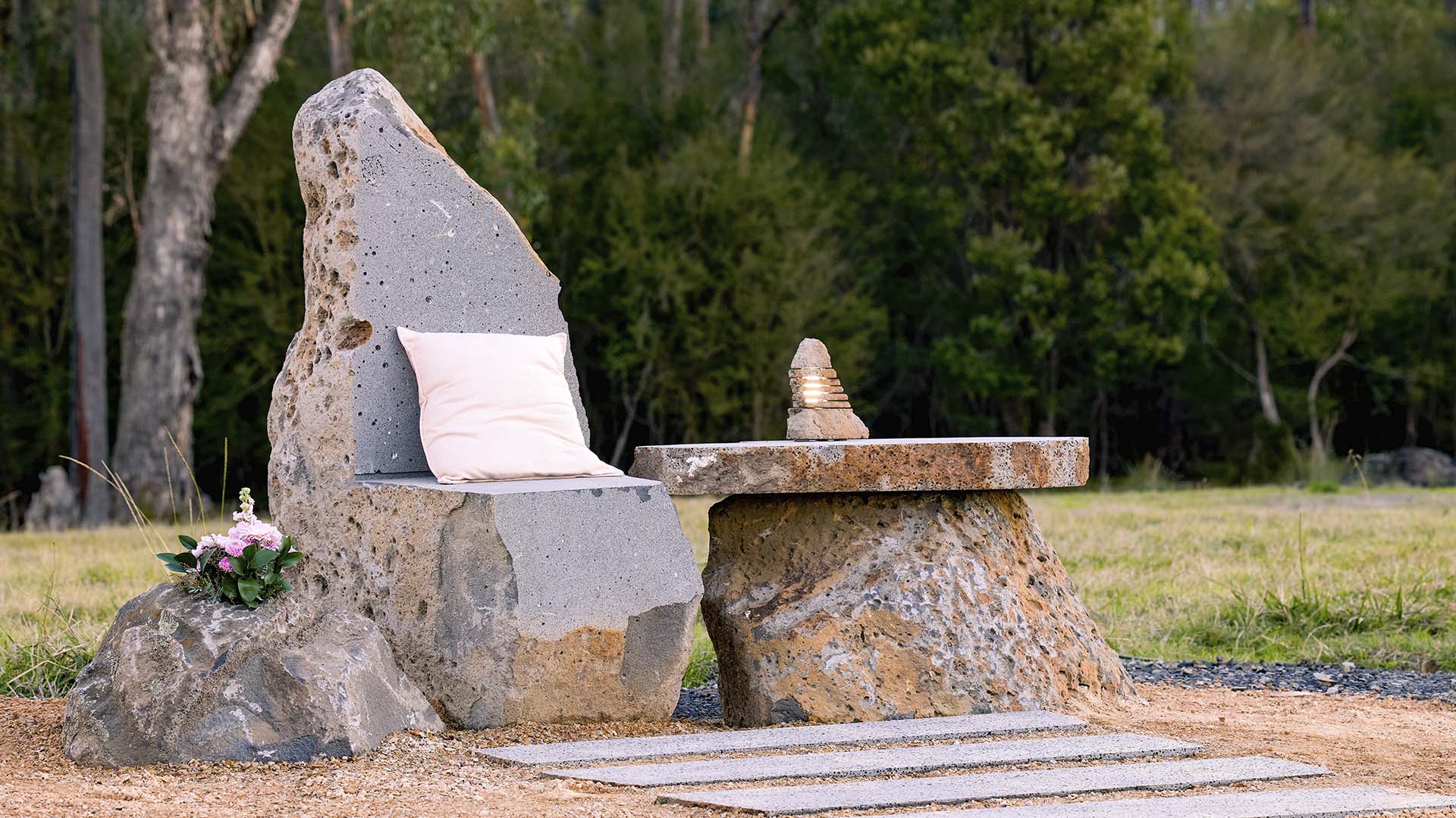 Carved from Australian stone with a silhouette inspired by ancient forms, the Cathedral Chair brings elegance to any outdoor space. Its high, organic backrest offers not just support, but a place to pause, reflect and survey your kingdom.